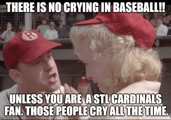 The baseball playoffs have been taking up a lot of my time this week. The games have been surprising and, in some cases, spectacular. Yesterday’s pitching battle between the Houston Astros and the Seattle Mariners ran to 18 innings, longer than any playoff game ever, I believe. There were three other games on yesterday as well, and because of the long game, I wasn’t able to see any of the others all the way through. And the games have been long in other ways. The Dodgers/Padres game was only nine innings, but I think it ran four and a half hours. And by the way, about the meme, I was really rooting for the Cardinals this year. It would have been so much fun to see Albert Pujols, Yadi Molina, and Adam Wainwright finish their careers in the playoffs.